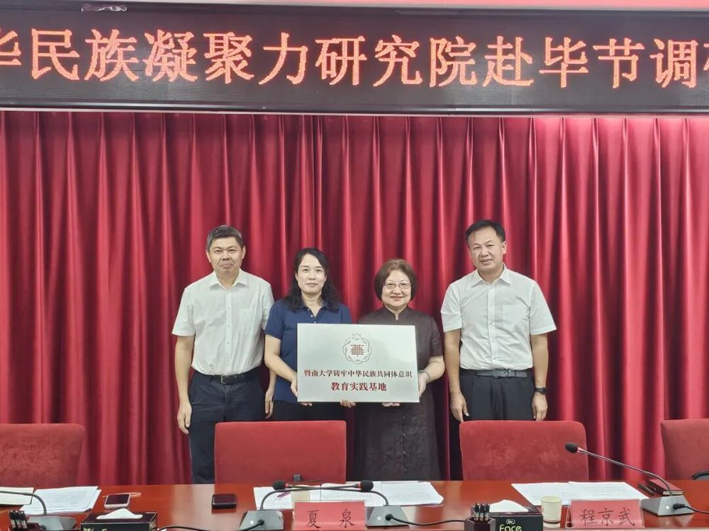 在与会人员的共同见证下,暨南大学中华民族凝聚力研究院院长、铸牢中华民族共同体意识研究基地常务副主任程京武与毕节市民宗委主任沈允共同签署了《合作共建协议》,并举行“铸牢中华民族共同体意识宣传教育实践基地”授牌仪式。根据协议,双方将以“优势互补、资源共享、合作共赢”为原则,围绕共建教育实践基地、联合开展实地调研、共同推进中华民族共同体建设等方面展开深入合作。
