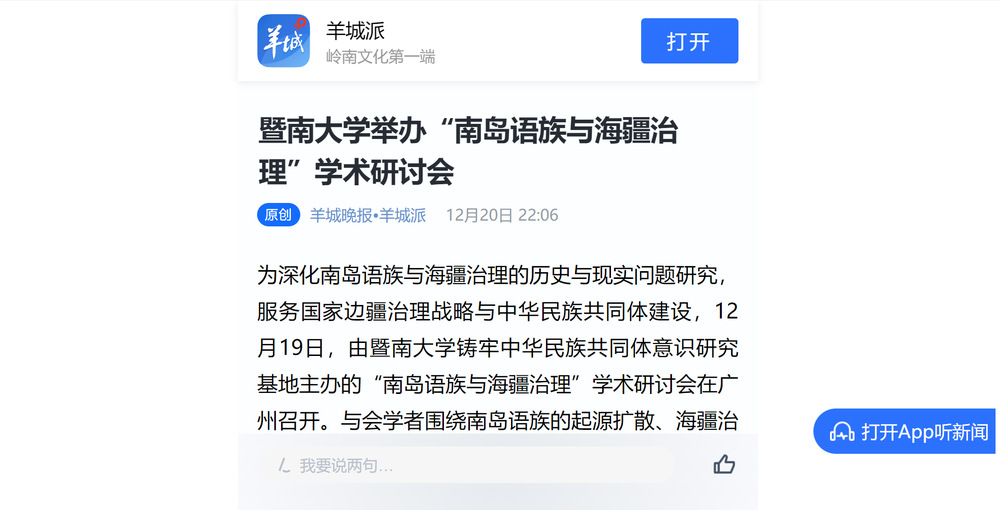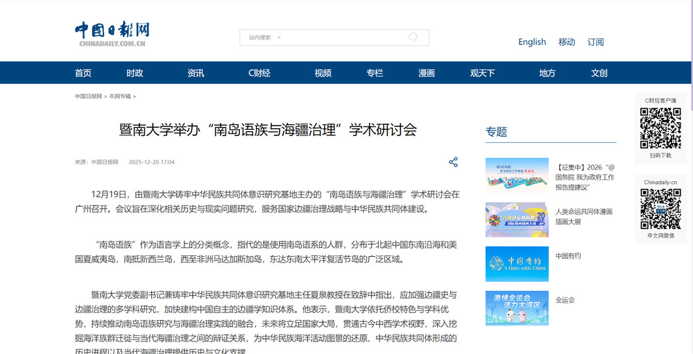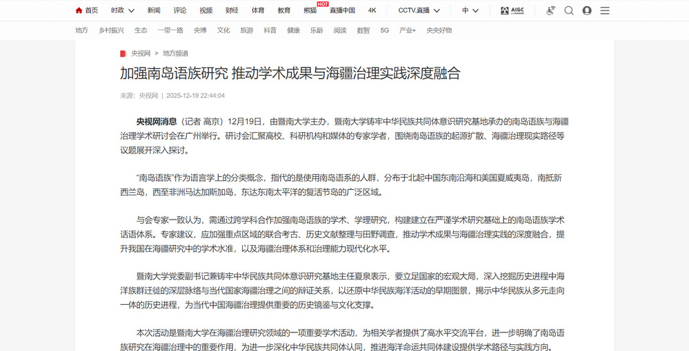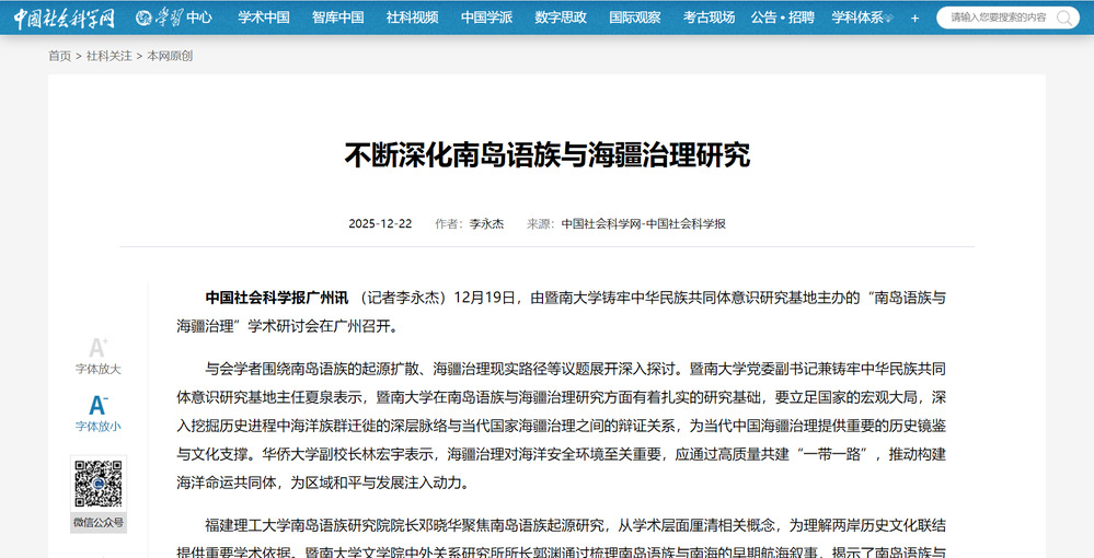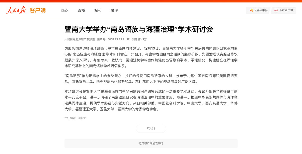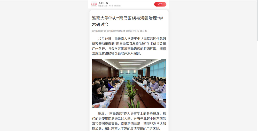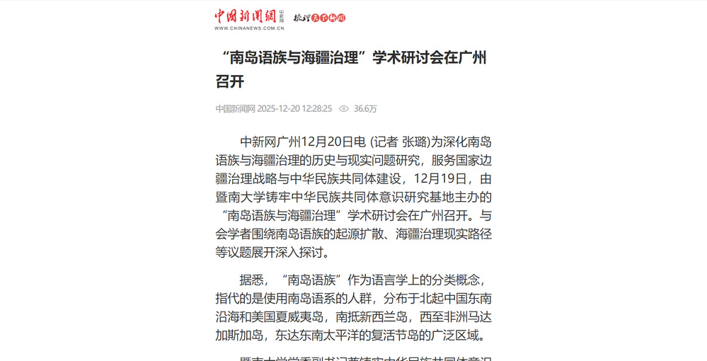 2025年12月19日,由暨南大学铸牢中华民族共同体意识研究基地主办的“南岛语族与海疆治理”学术研讨会在学校广州石牌校区召开。人民日报、光明日报、新华网、中国新闻网、央视网、中央广播电视总台广东总台、中国社会科学报、中国社会科学网、中国日报网、羊城晚报等多家媒体聚焦会议进行报道。